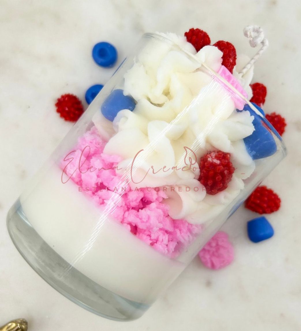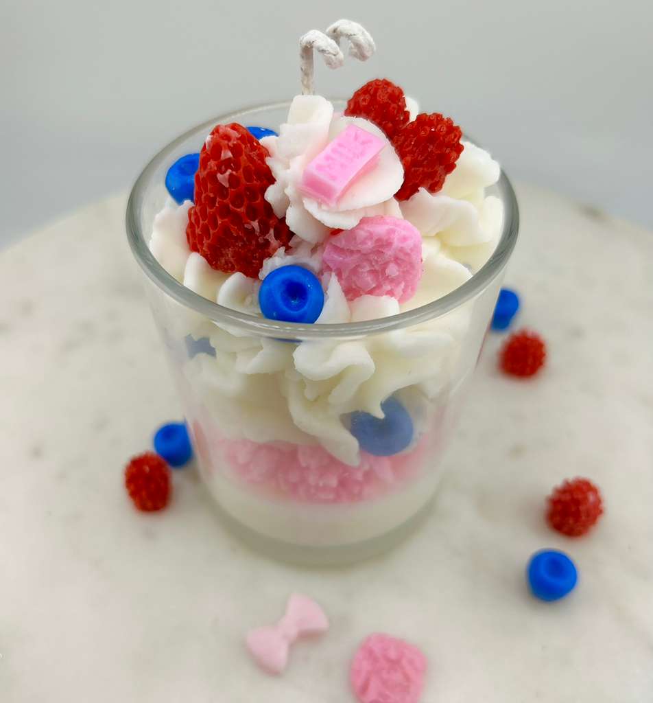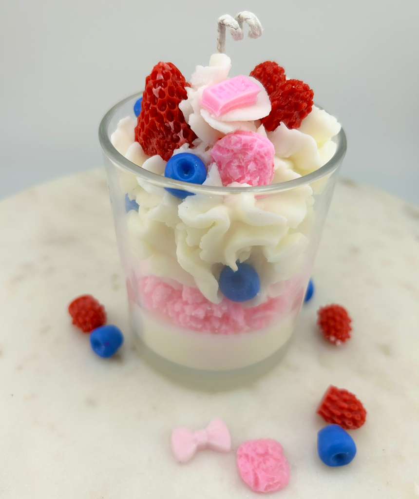 Handcrafted candle made with coconut wax, featuring a sweet, creamy aroma inspired by berries and candy treats. Playful and cozy, perfect for adding a fun and cheerful touch to any space.
