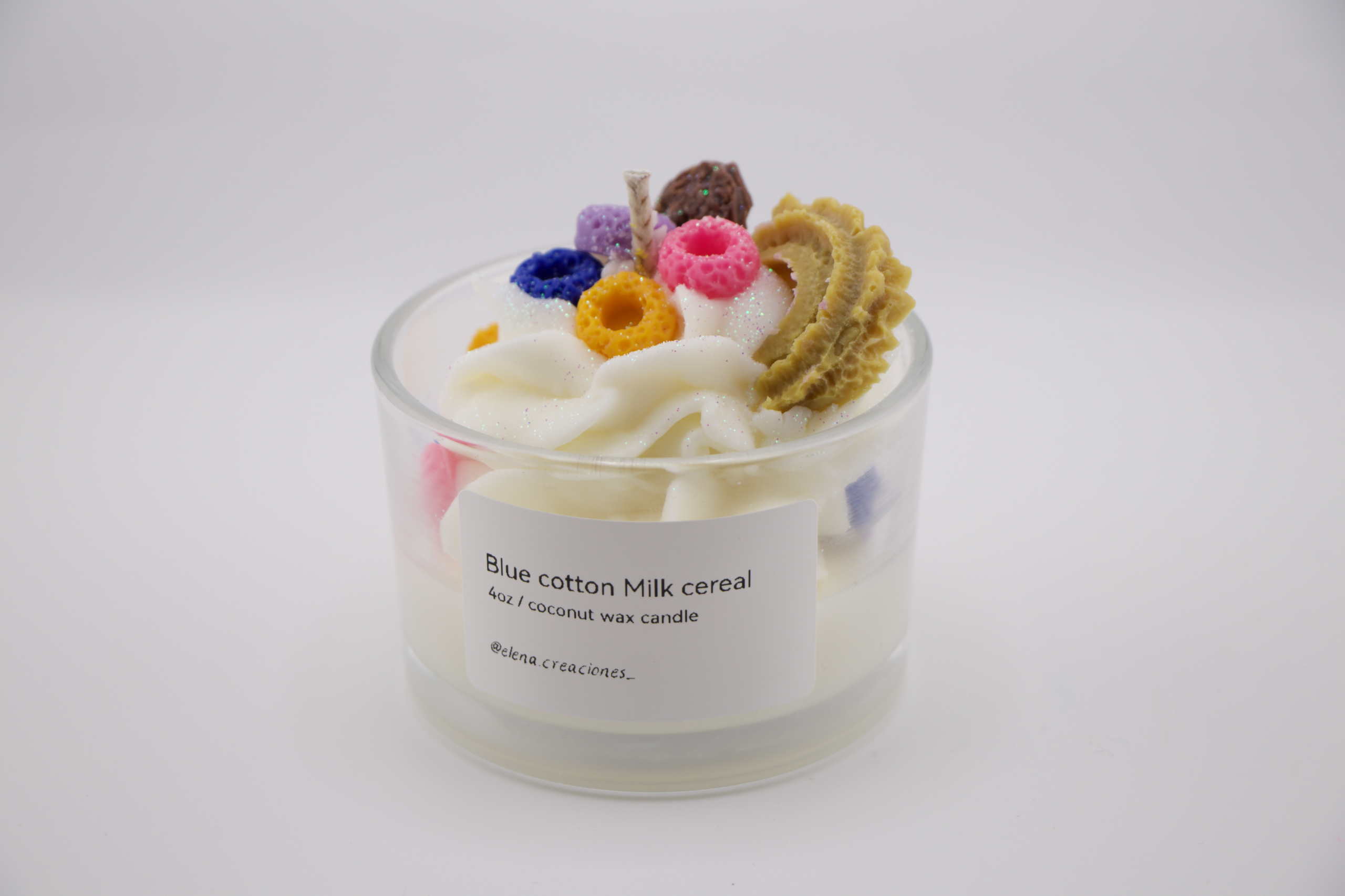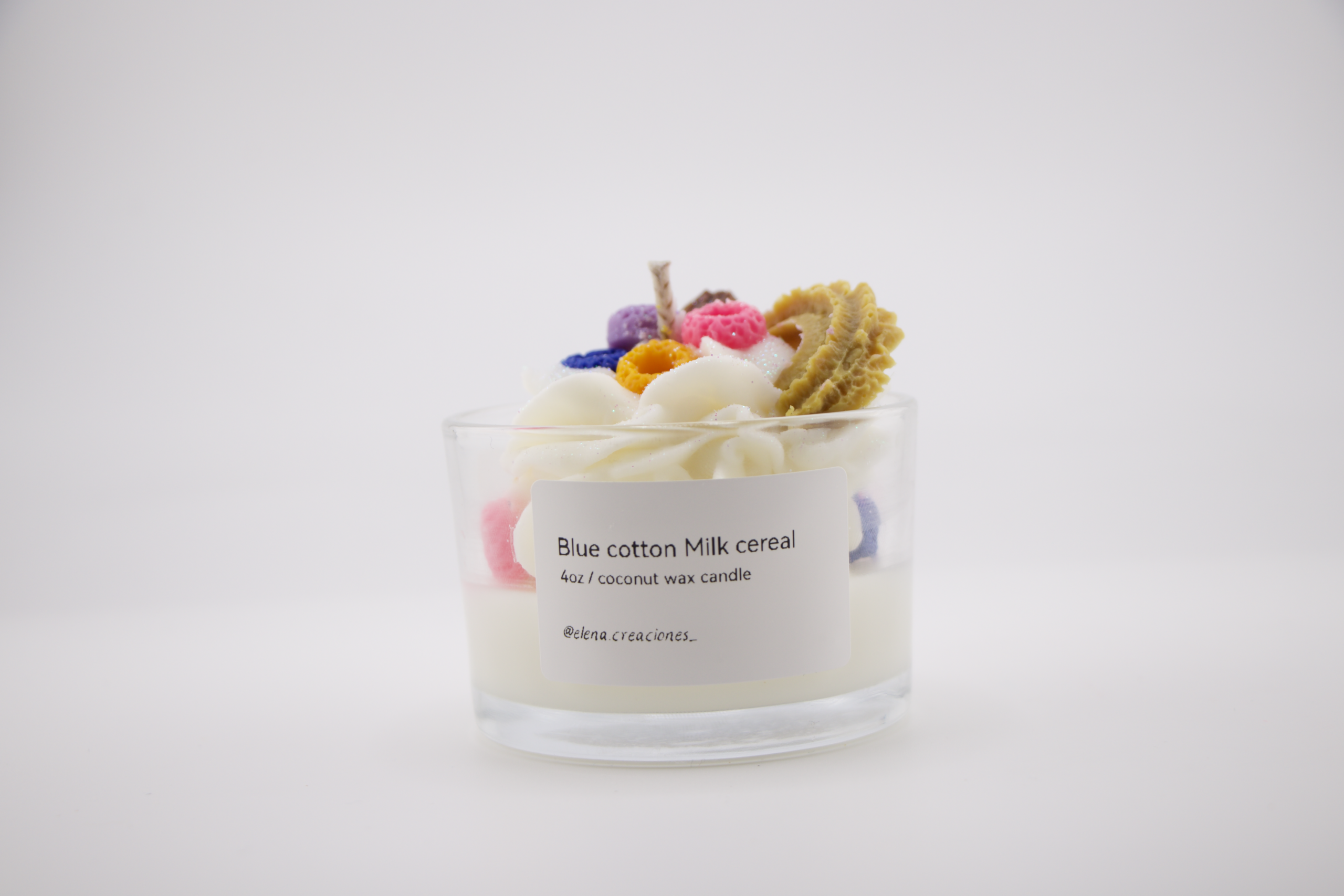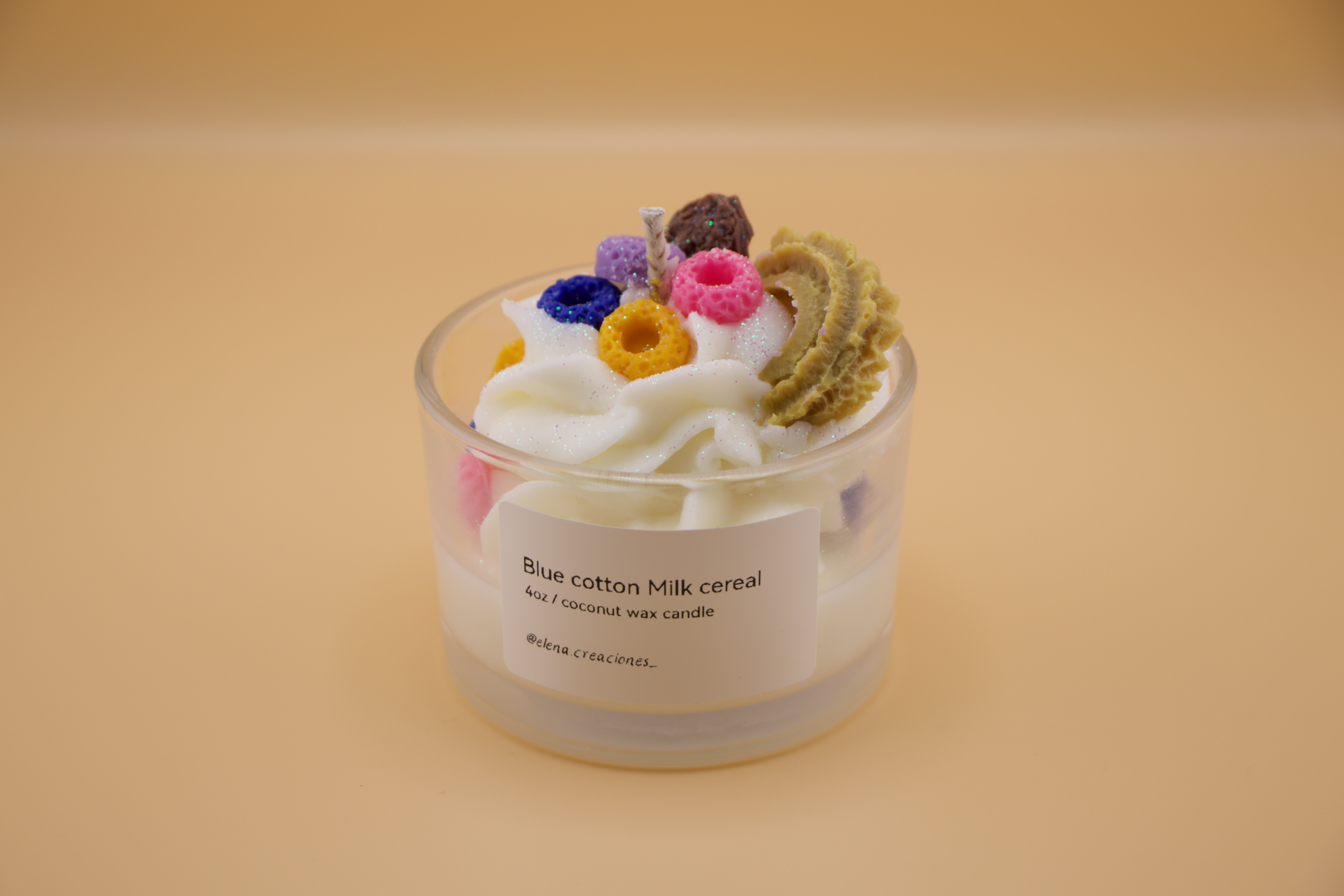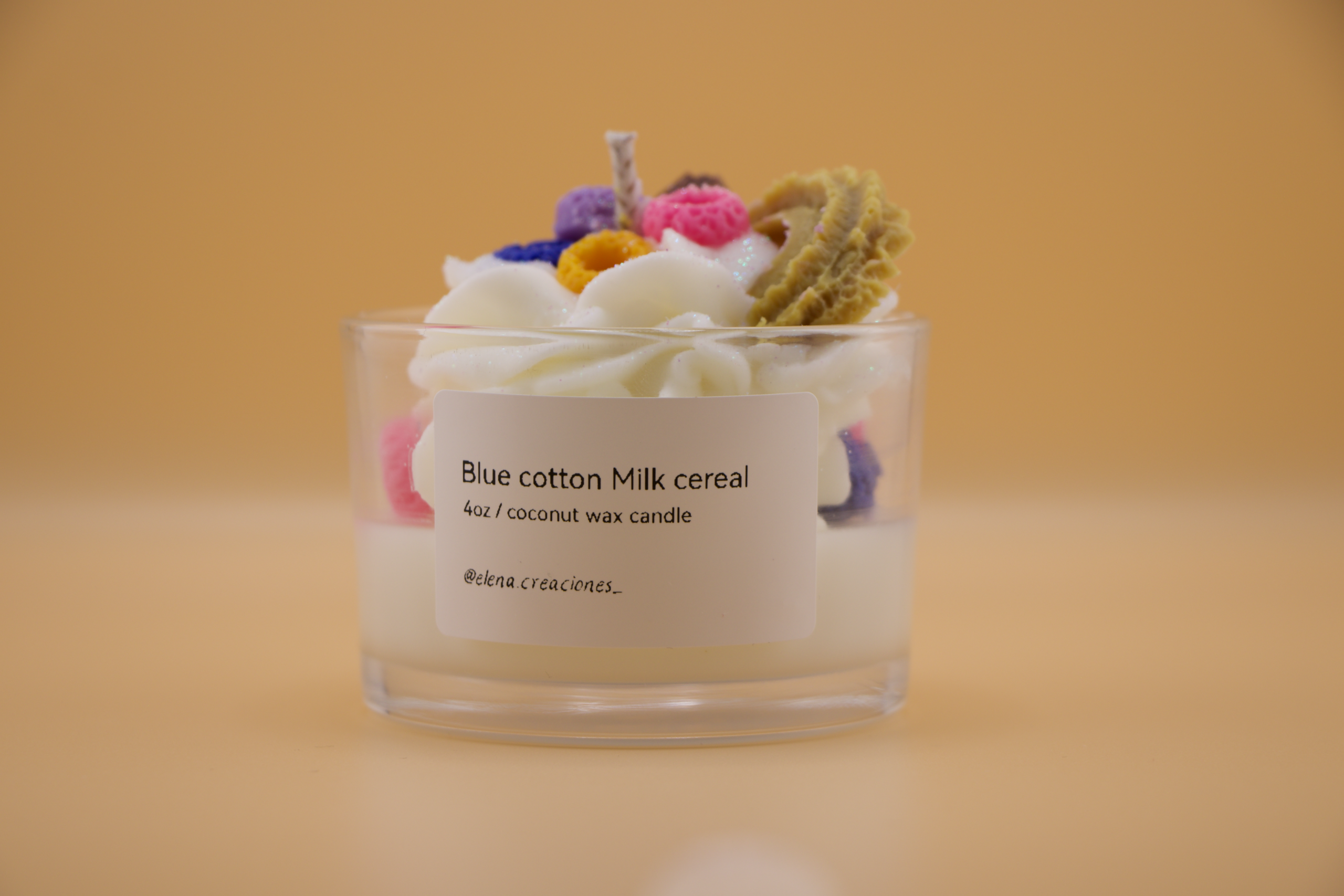Handcrafted candle made with coconut wax, with a sweet and creamy scent reminiscent of cereal with milk and a hint of cotton candy. Ideal for creating a cheerful, cozy, and nostalgic atmosphere.
