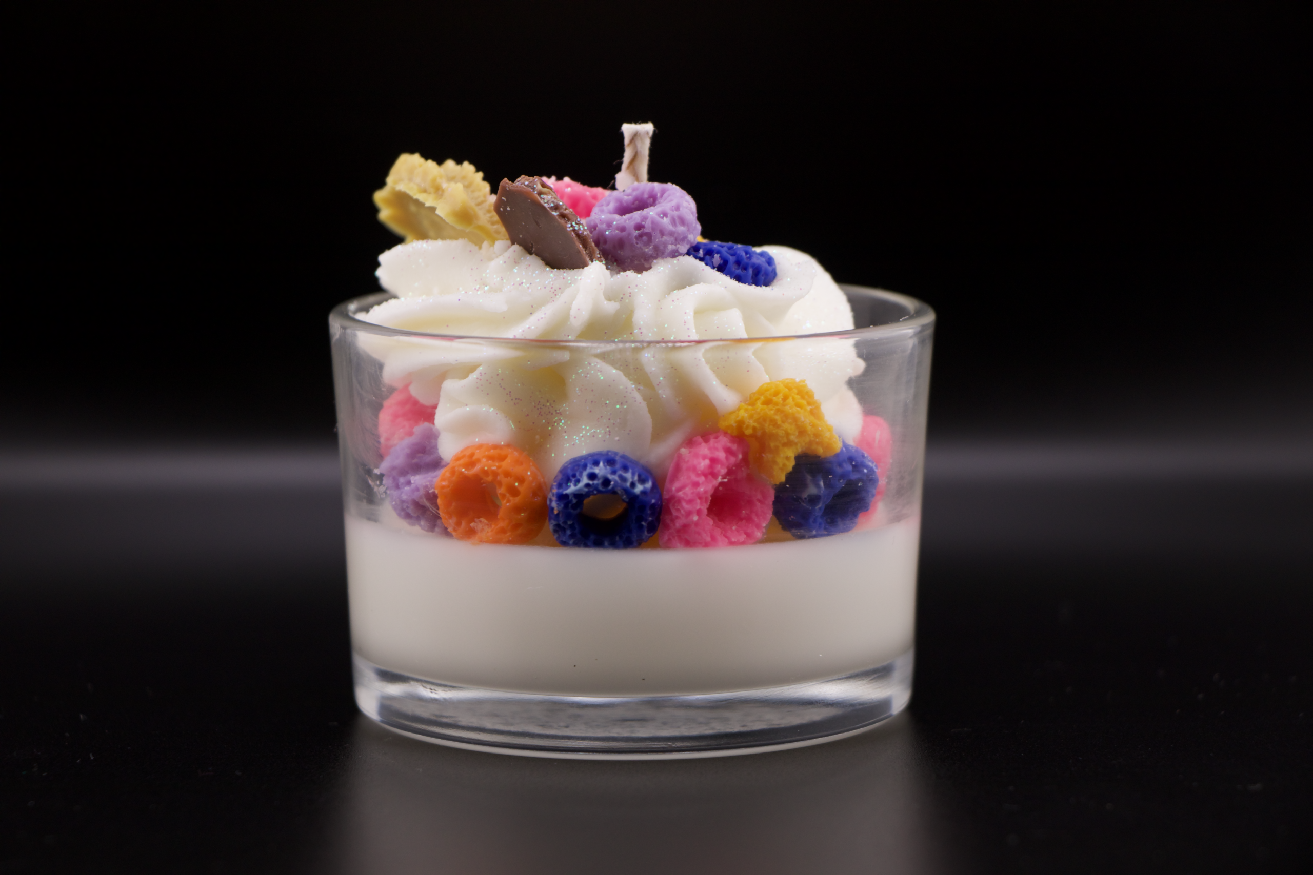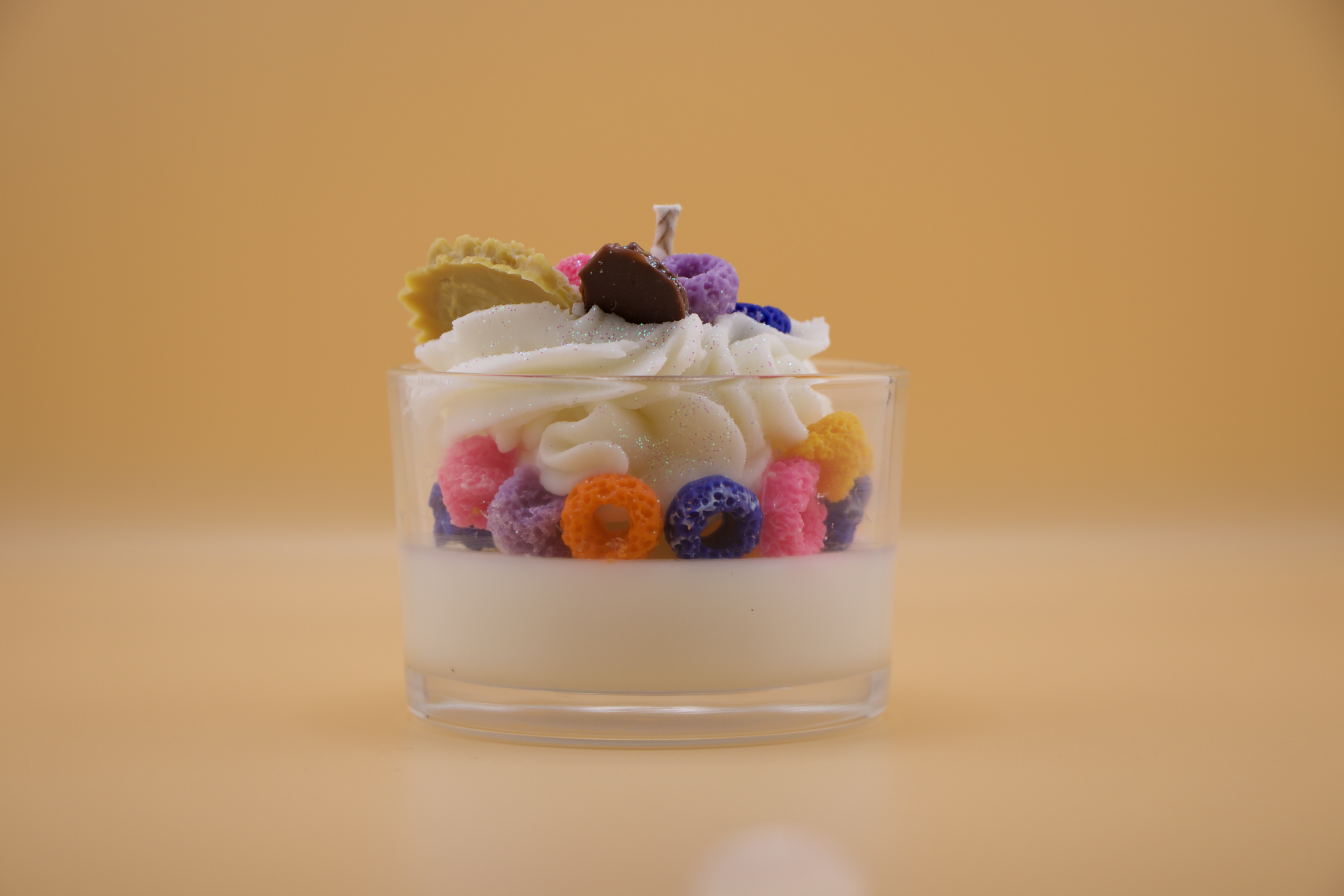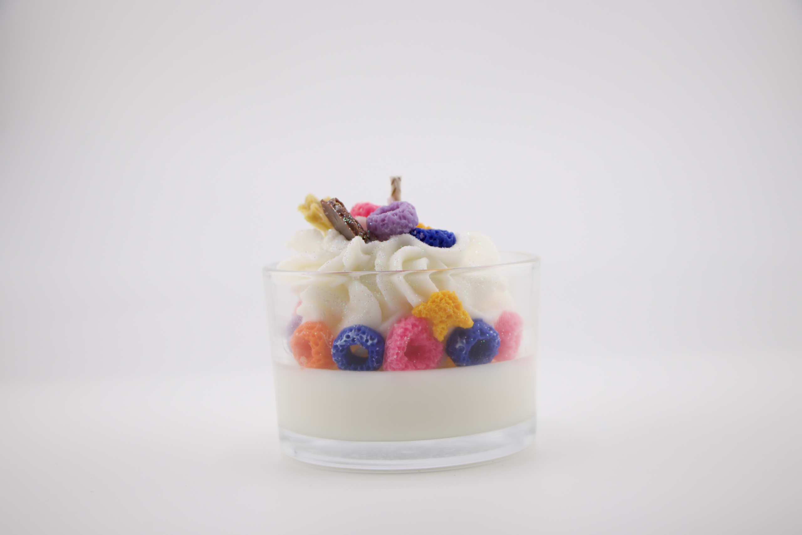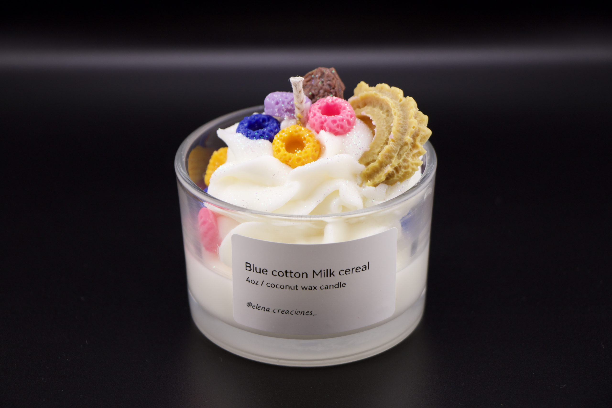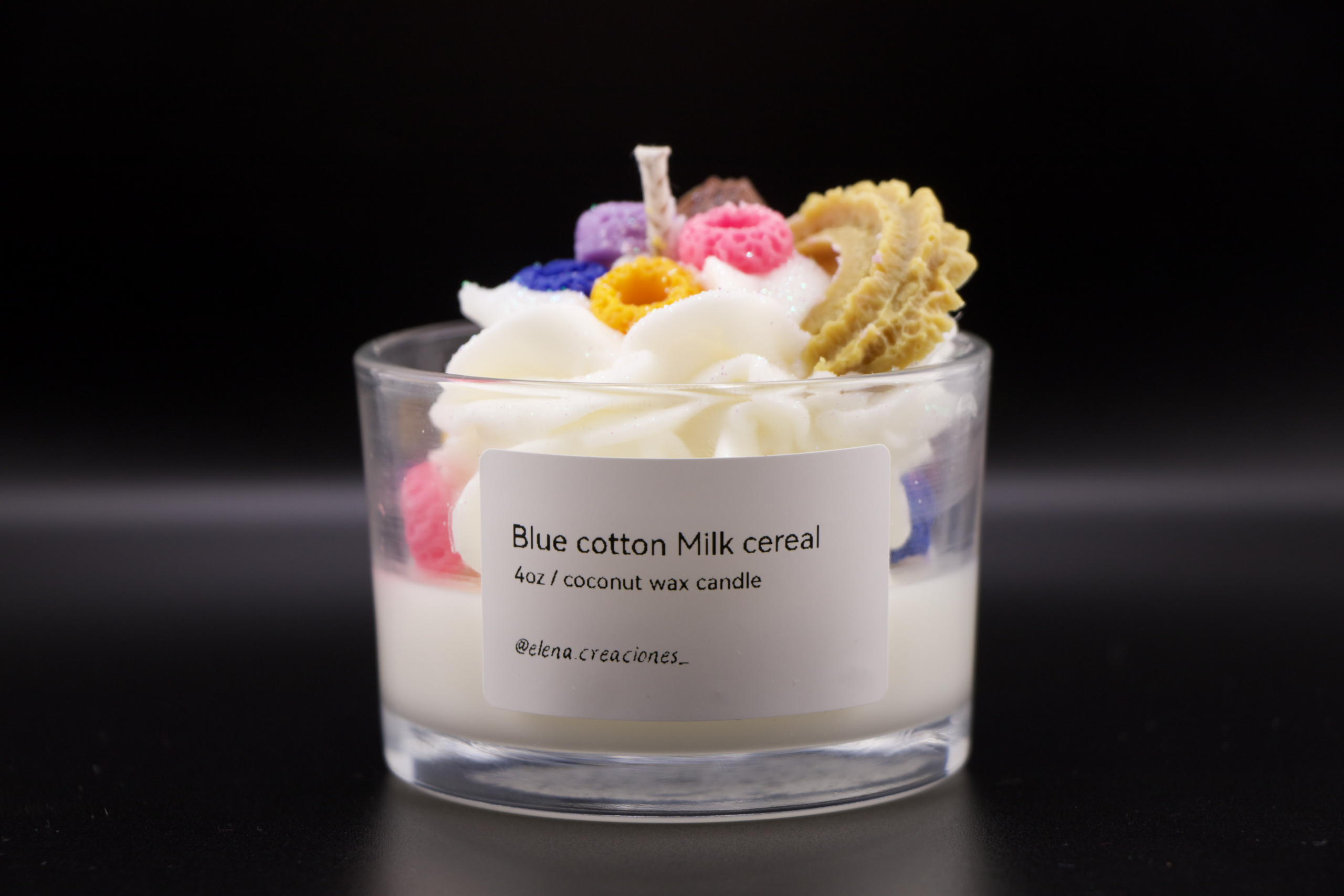 Handcrafted candle made with coconut wax, with a sweet and creamy scent reminiscent of cereal with milk and a hint of cotton candy. Ideal for creating a cheerful, cozy, and nostalgic atmosphere.